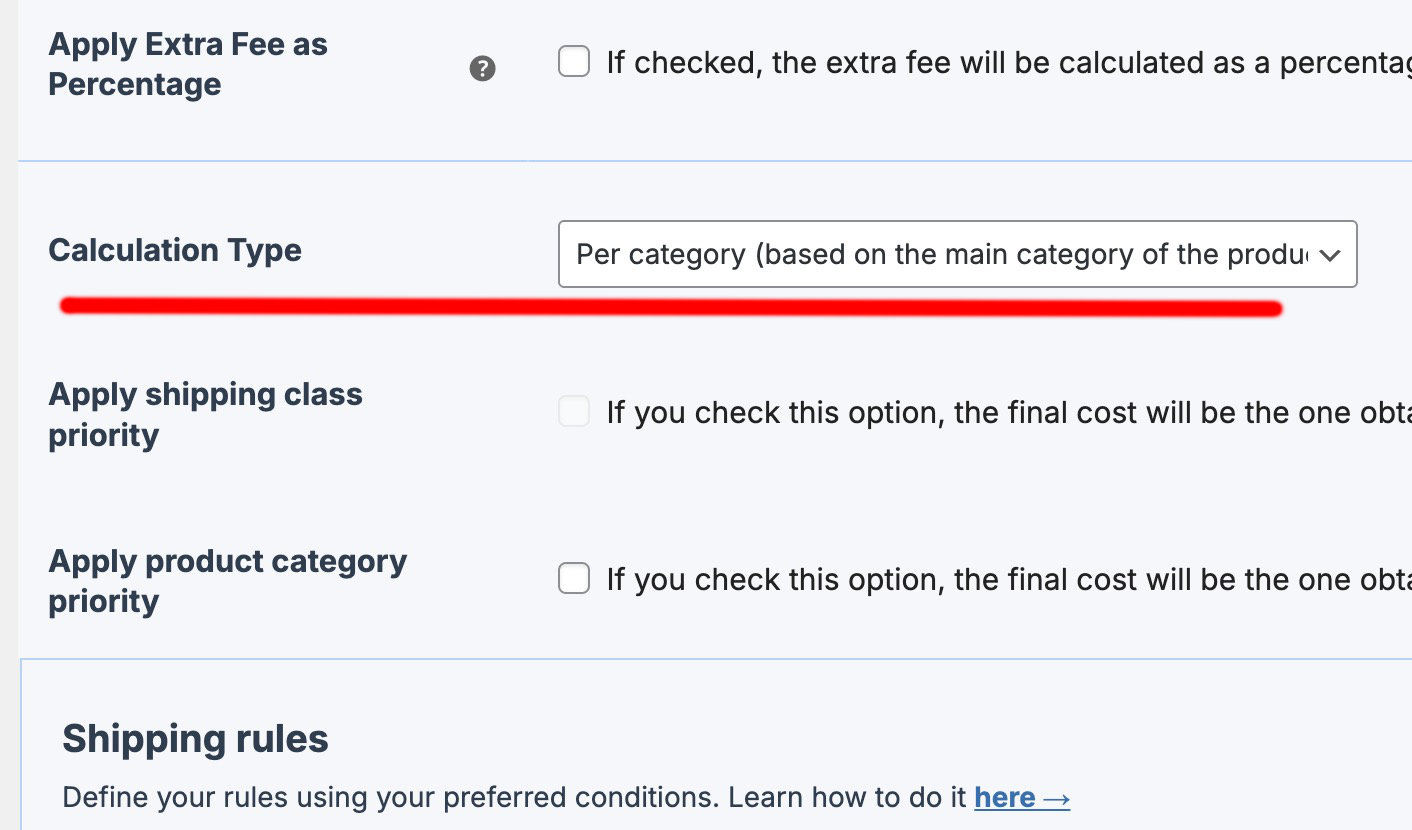 This type of calculation is similar to “Per shipping class,” but in this case, instead of assigning one or more shipping classes to a set of items, you can group costs for an entire category.