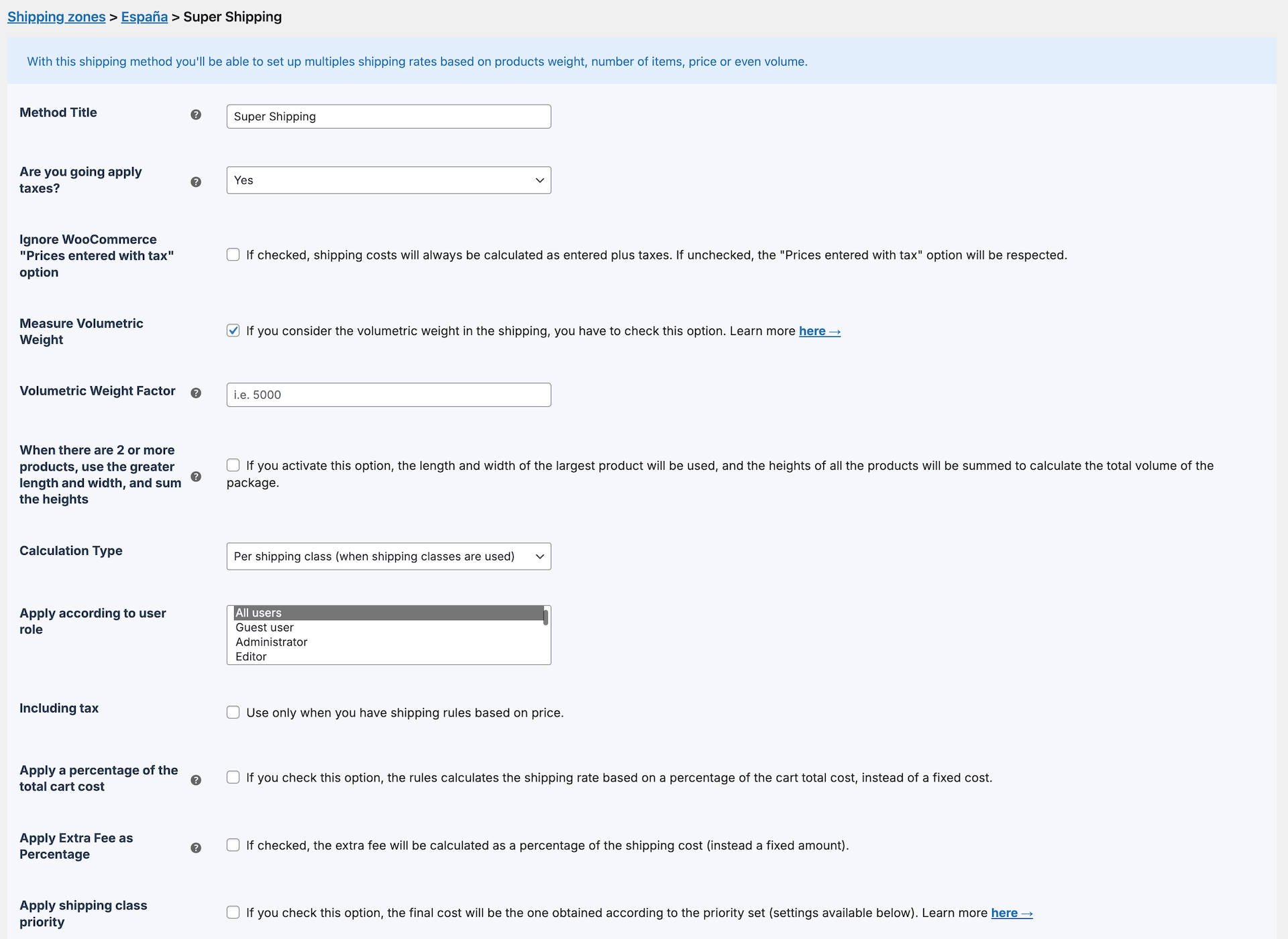 – Per Shipping Class (when shipping classes are used) -> This is the option to choose whenever shipping classes are used. Otherwise, Super Shipping will not take into account the classes assigned to the products. - Apply by user rol. This field allows you to specify which type of user the shipping rate will apply to.