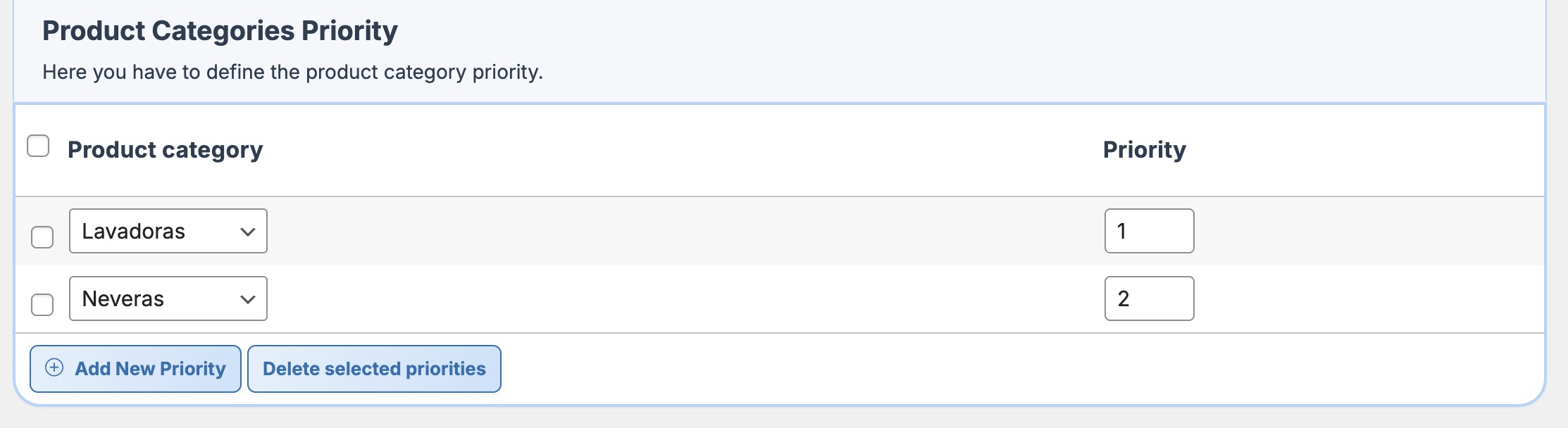 Below is an example of priorities for two categories, where the «Lavadoras» category has the highest priority.
