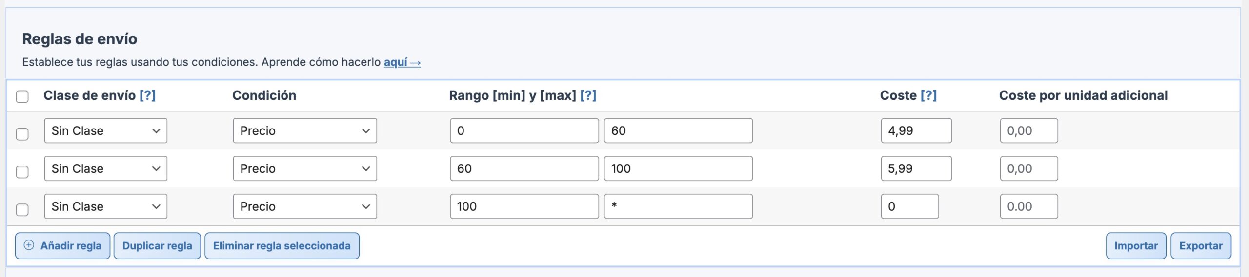 Por último, solo te queda definir las reglas de envío en base a las que se calculará el coste de envío.