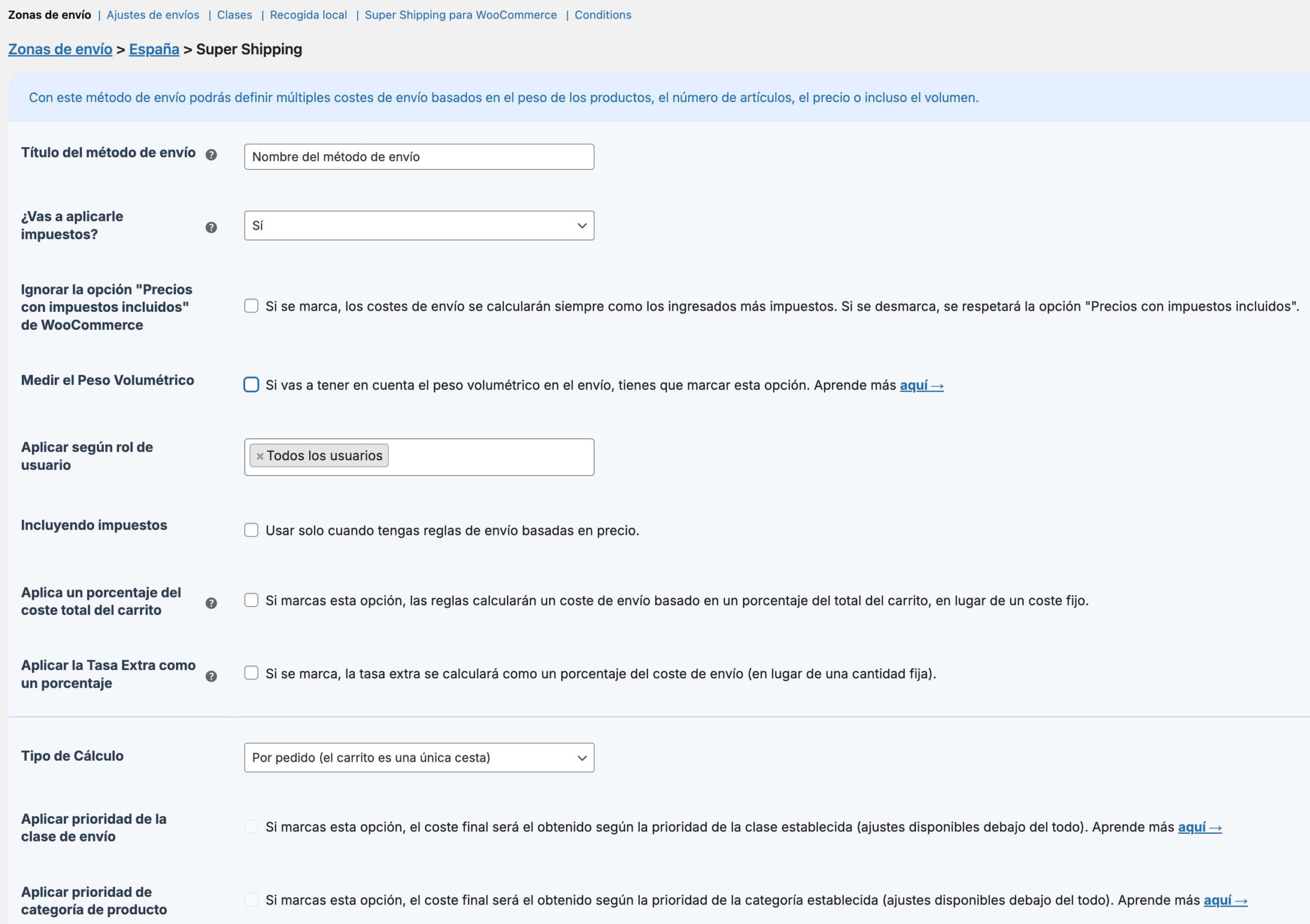 En este momento, edita los ajustes que desees aplicar a este método de envío en particular. Tienes la explicación de estas opciones en la página de Ajustes Generales.