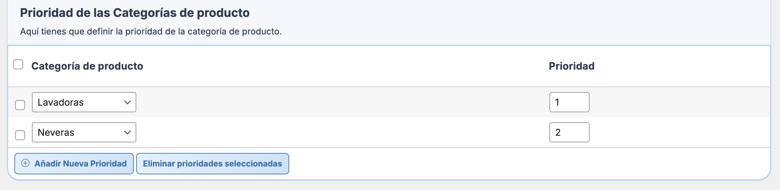 A continuación muestro un ejemplo de prioridades para dos categorías, en el que la categoría «Lavadoras» es la de mayor prioridad.