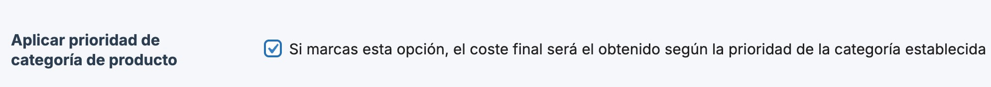 Cuando está activada la prioridad de categoría de producto, sólo se aplicará el coste de la categoría con mayor prioridad.