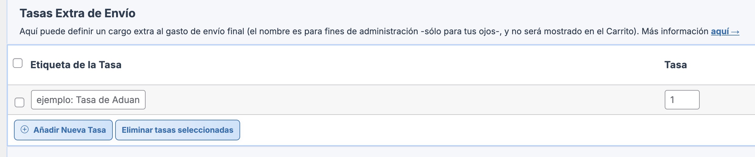Las tasas extra de envío se utilizan para añadir un cargo extra al gasto de envío final pero no queremos (o no necesitamos) añadirlo en la configuración de las reglas y los rangos de precios).